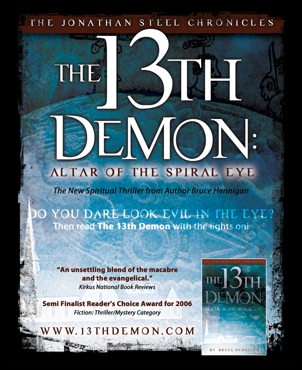 My debut novel, “The 13th Demon: Altar of the Spiral Eye” is available this week and my launch party is Friday night, October 7th, 2011 from 6 to 8 P.M. at Brookwood Baptist Church (corner of I49 and Bert Kouns) in the Well, the coffee shop. I will be introducing the ink*well, a regional Christian artists’ community and speaking briefly on “One Book’s Journey: How to Get Published”. Those who purchase a book are entered into a drawing for one of the following: an Ipad2, a nook touch, and a Kindle WiFi. Coffee and snacks are complementary. Click here for the flyer: bruce-flyer