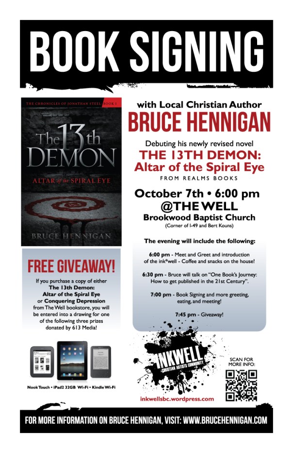 My debut novel, “The 13th Demon: Altar of the Spiral Eye” is available this week and my launch party is Friday night, October 7th, 2011 from 6 to 8 P.M. at Brookwood Baptist Church (corner of I49 and Bert Kouns) in the Well, the coffee shop. I will be introducing the ink*well, a regional Christian artists’ community and speaking briefly on “One Book’s Journey: How to Get Published”. Those who purchase a book are entered into a drawing for one of the following: an Ipad2, a nook touch, and a Kindle WiFi. Coffee and snacks are complementary. Here is a pdf file of the flyer for the event: bruce-flyer