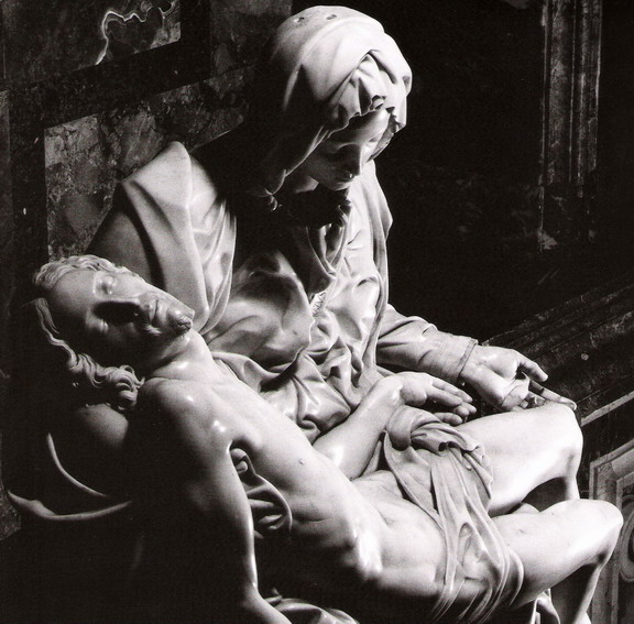Mary looks up as if looking at Christ on the cross and hugs herself in pain.
