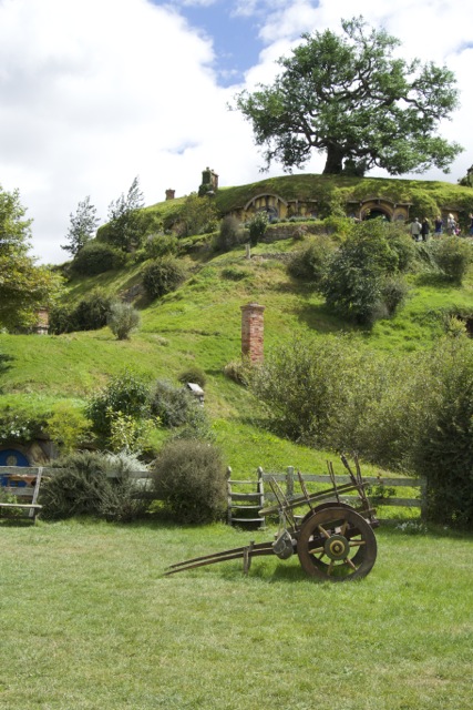 In the rolling hills between Waitomo and Hamilton New Zealand there is a sheep farm, a quite large sheep farm. And, hidden away in these rolling hills dotted with grazing sheep and large boulders that seemed poised to roll down the hill and tall, feather like trees pointing to heaven and tall, green hedges to block the nonstop wind there is a tiny village that is truly magical. It is Hobbiton.